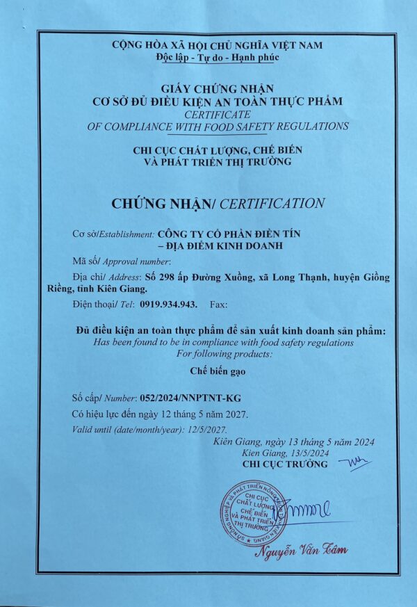 - Giấy chứng nhận: cơ sở đủ điều kiện an toàn thực phẩm số 052/2024/NNPTNT-KG